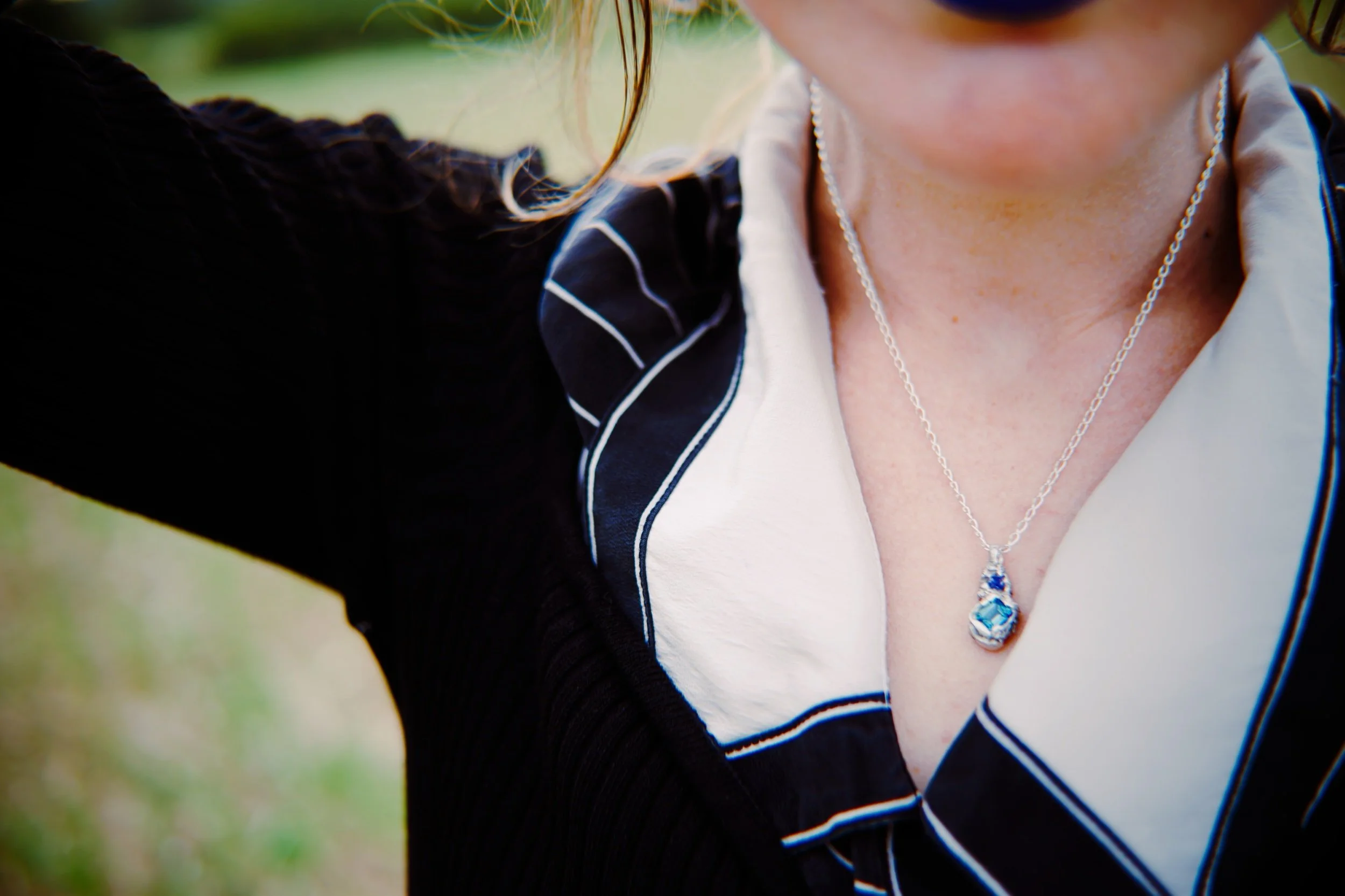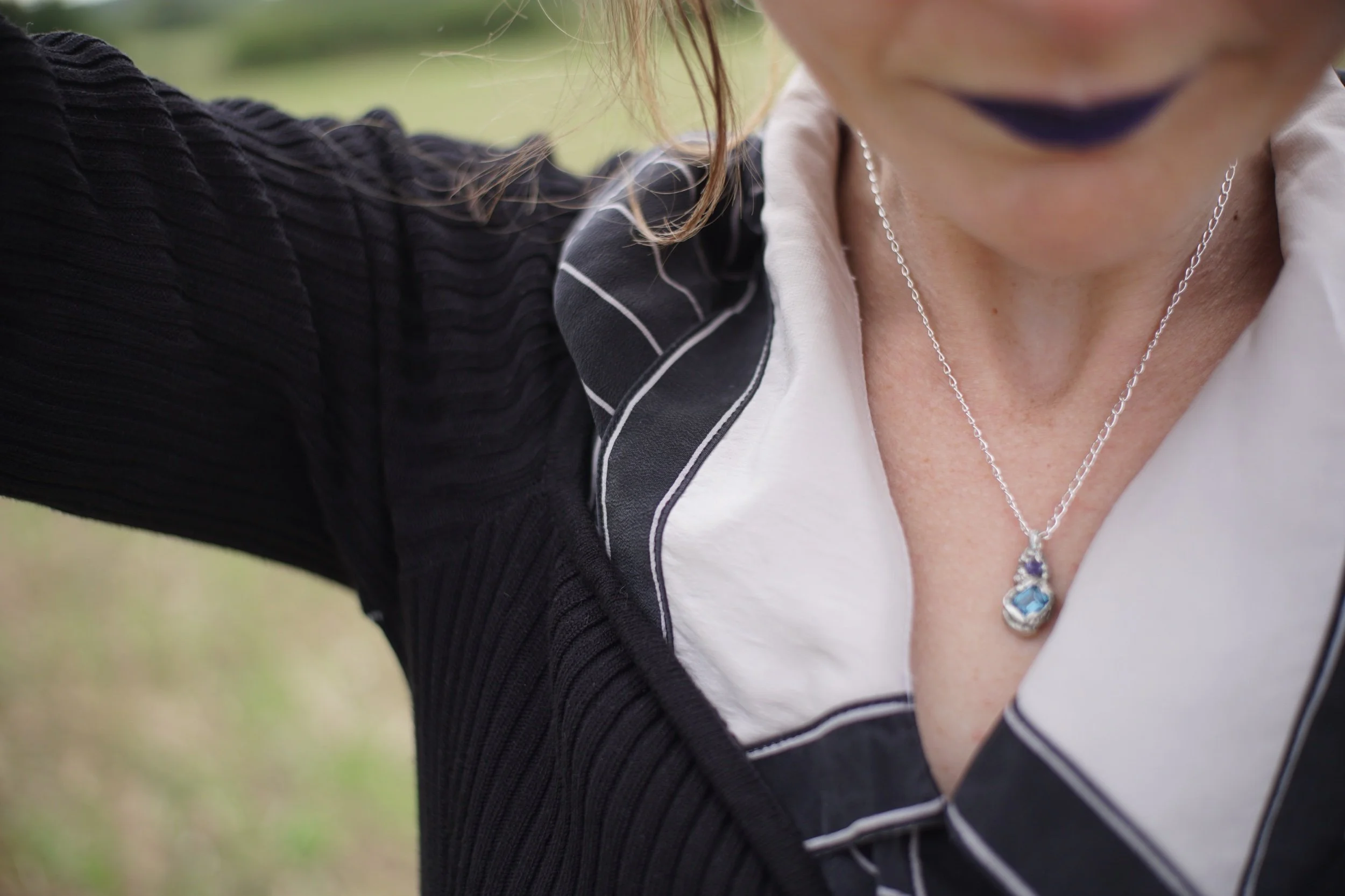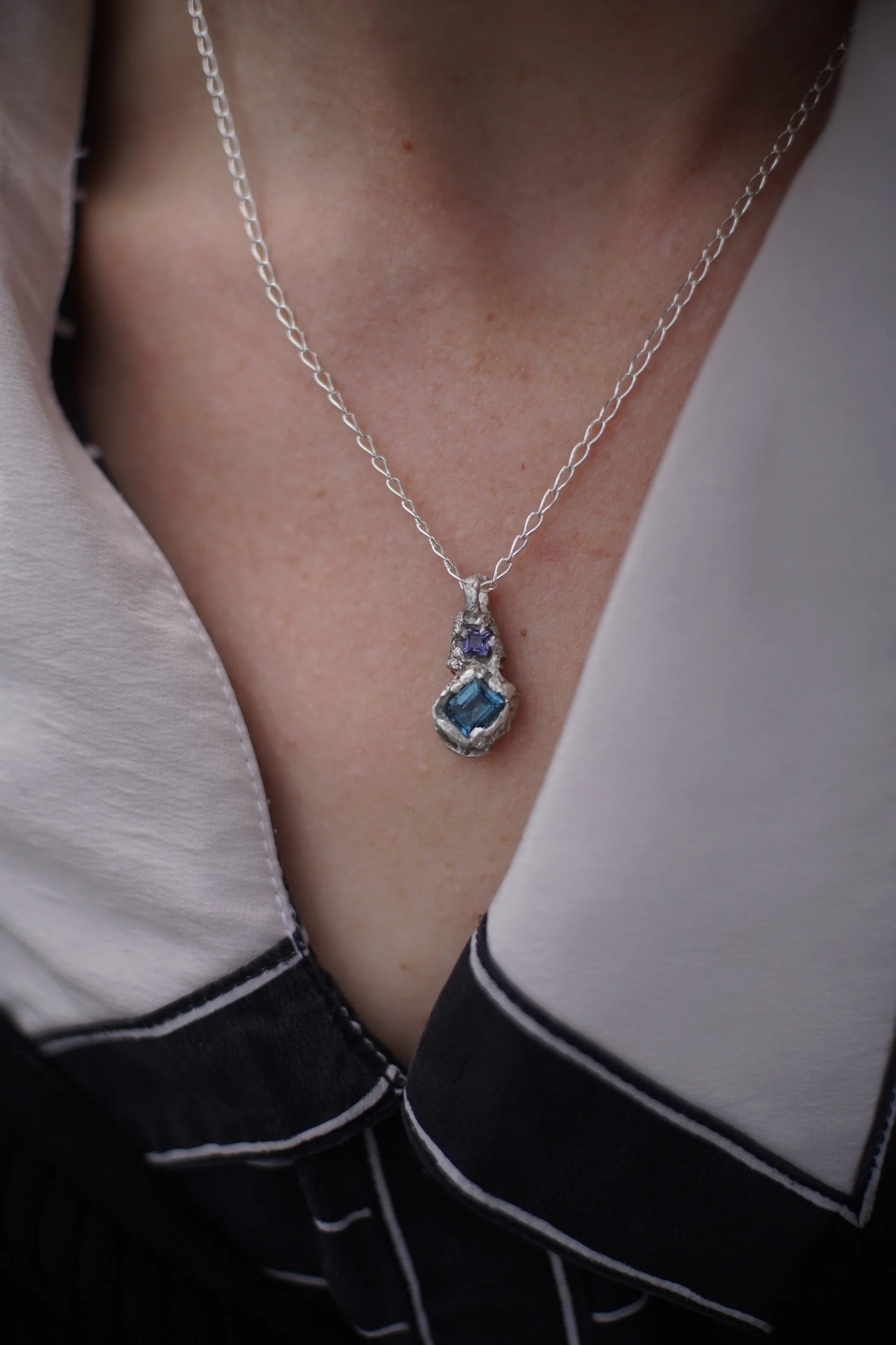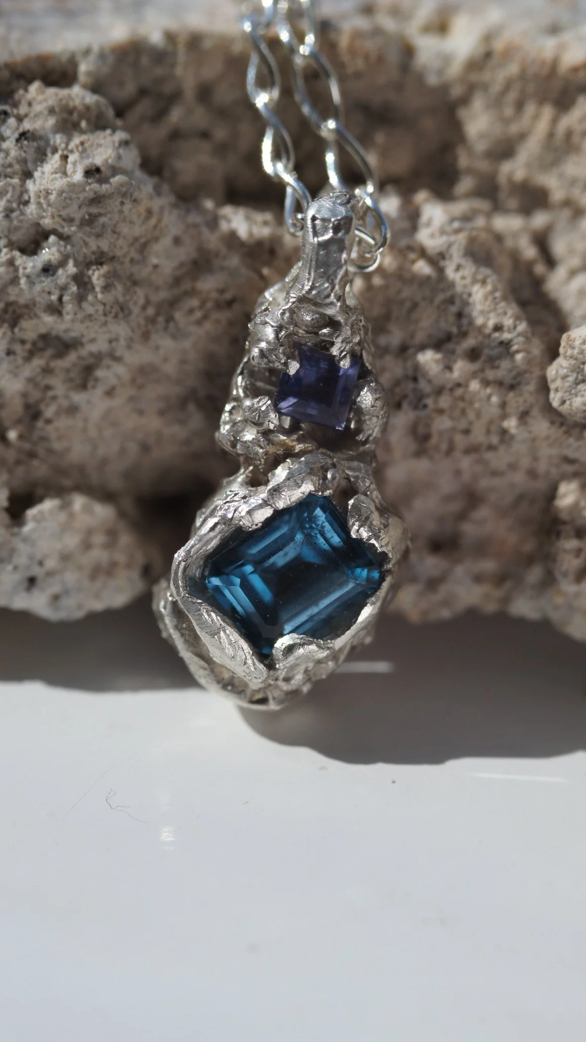 One for the blue lovers, made with a 6x5mm octagon London blue topaz and a square iolite, claw set in silver. With a 16” silver chain link necklace.