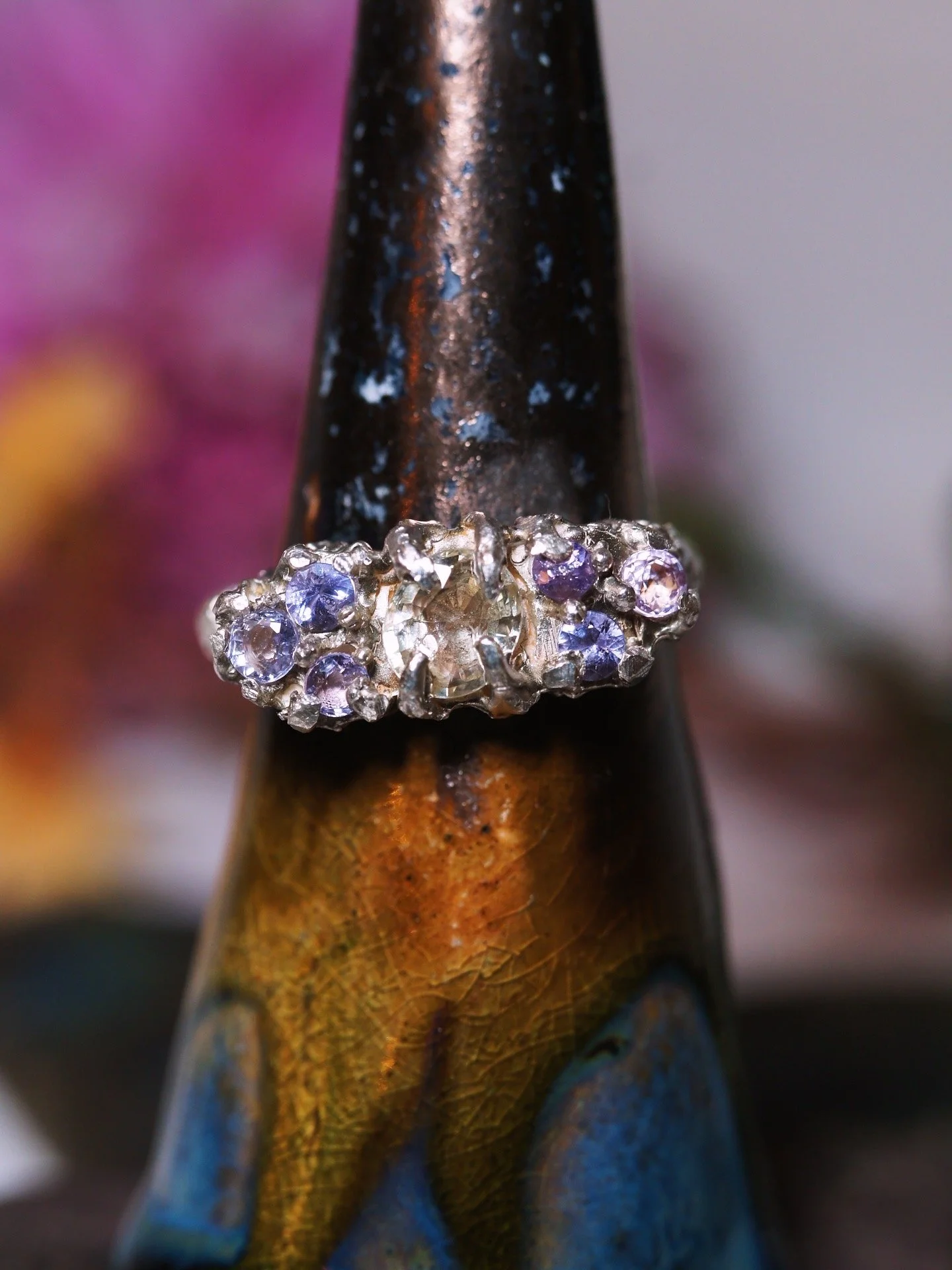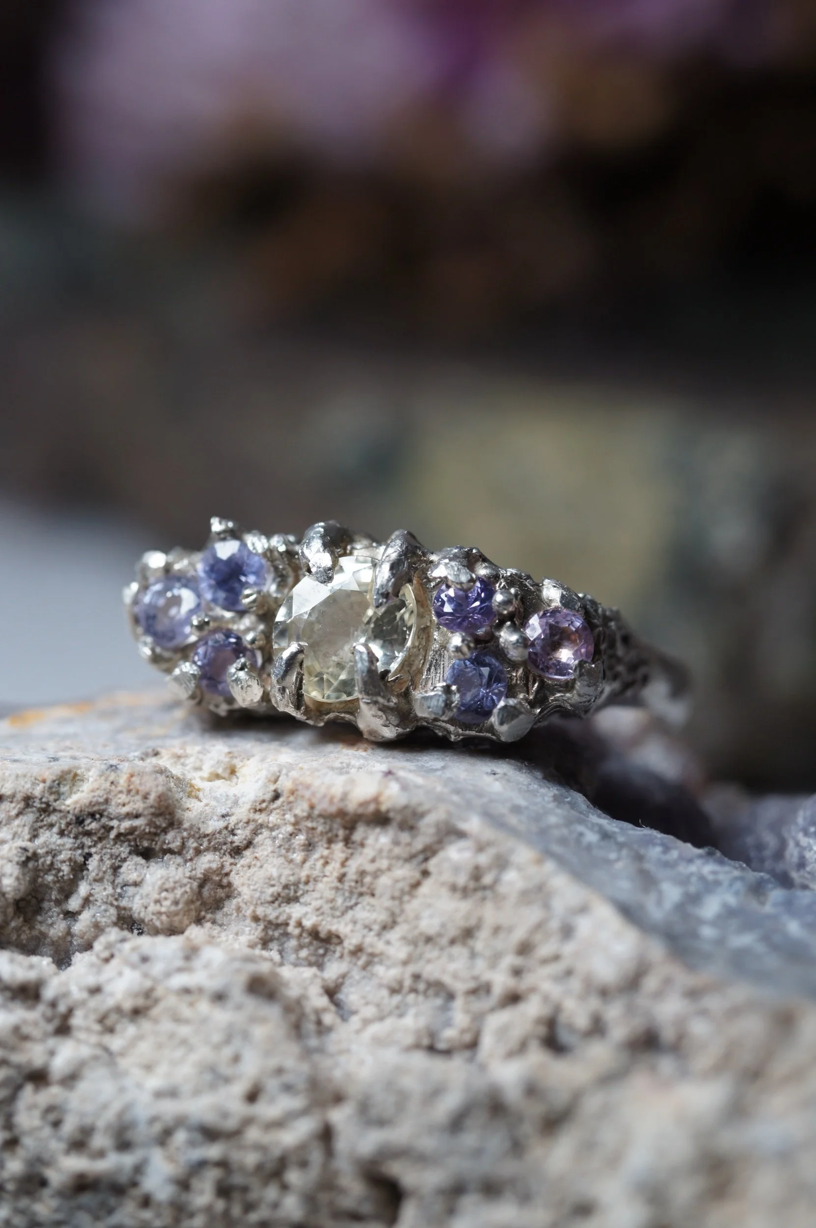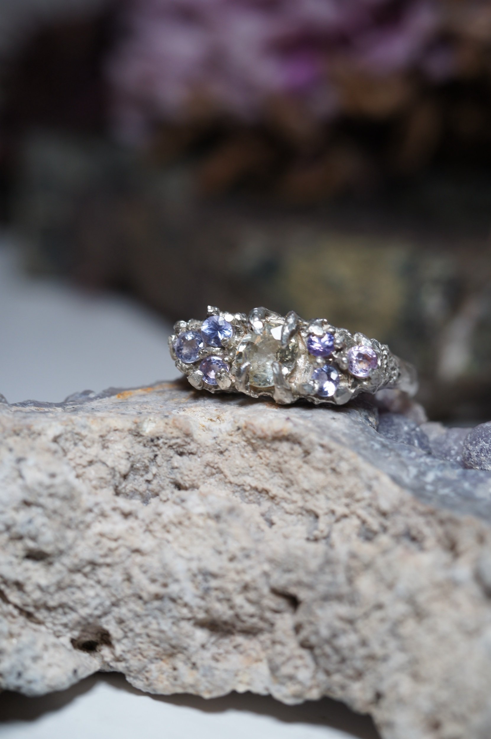 Claw set to the max and made for those who love softer colours and bolder statements. Featuring a light yellow oval 0.88ct Sapphire, and six lilac and lavender sapphires.