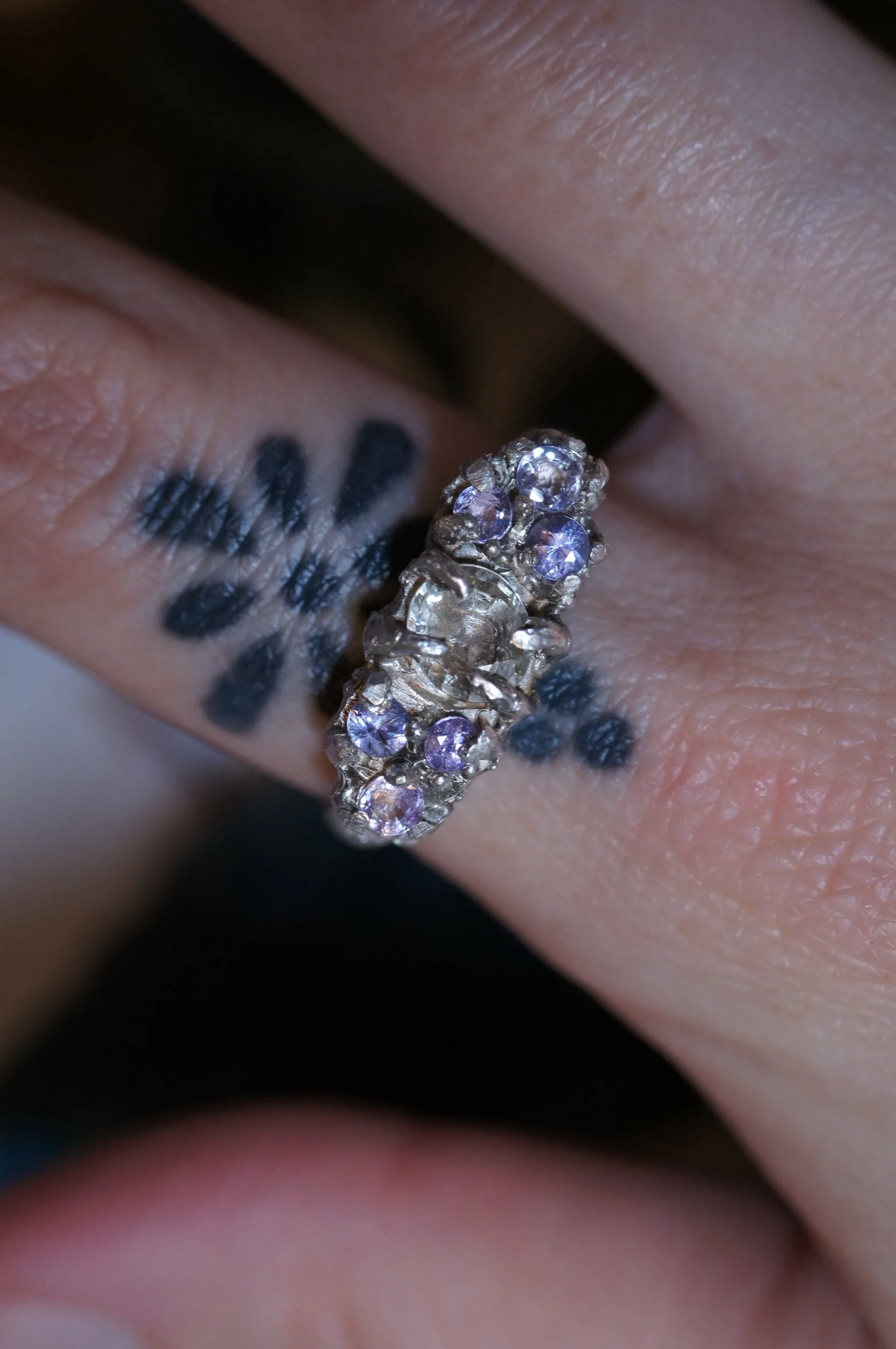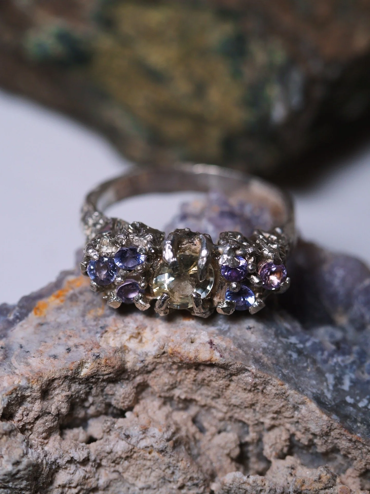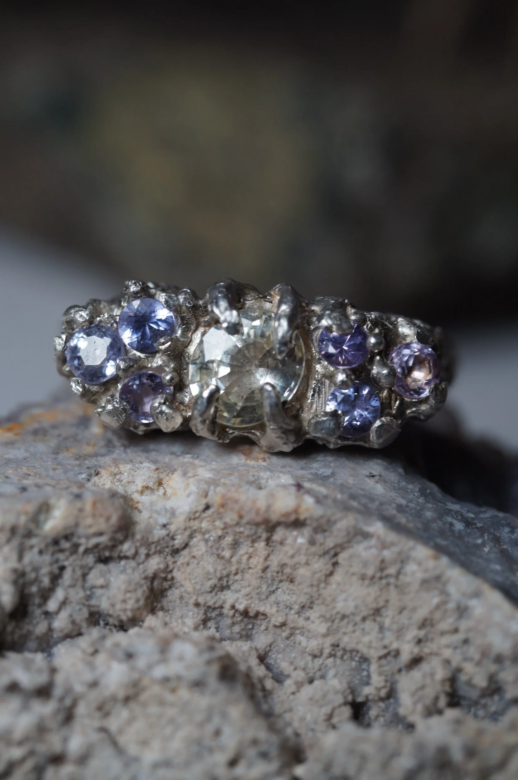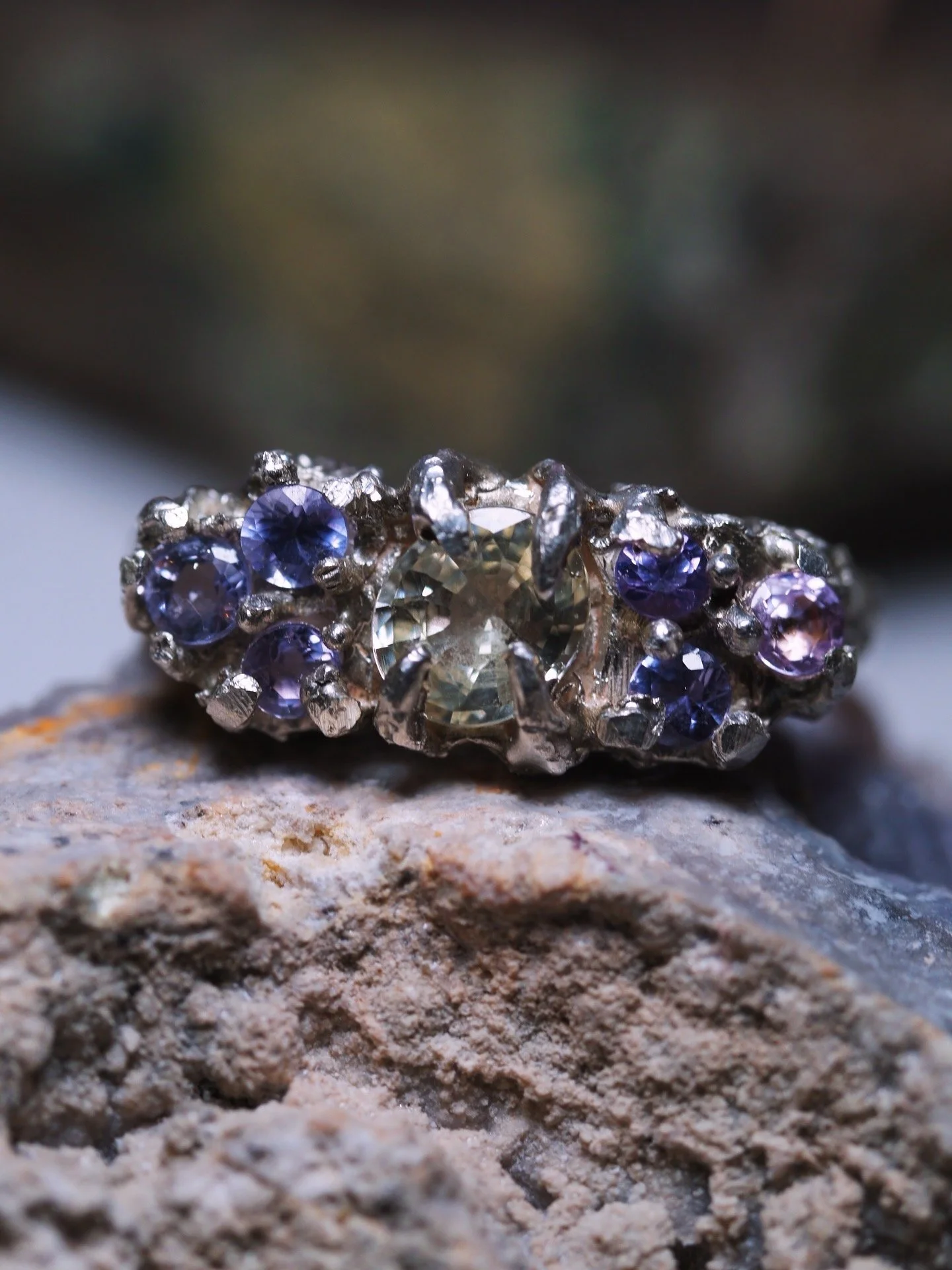 Claw set to the max and made for those who love softer colours and bolder statements. Featuring a light yellow oval 0.88ct Sapphire, and six lilac and lavender sapphires.